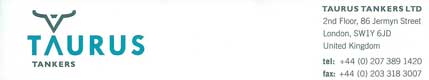 | Filiale de l'important groupe et armement   canadien Teekay, Taurus Tankers est un opérateur de grandes compagnies maritimes   mondiales de transport de produits pétroliers. La flotte Taurus Tankers comprend   une vingtaine de navires en 2014 et son siège commercial est situé à   Londres. La société a été dissoute le 4 avril 2017. | |