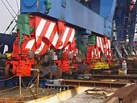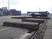 En attendant la partie la plus captivante : le déchargement, les travaux préparatoires se poursuivent. Dessaisissage en règle bien sûr, mais également implantation sur le quai des différentes poutres qui serviront à transférer la charge du portique depuis le navire vers le quai. Comme les photos ci-après le montrent, des bogies temporaires, perpendiculaires au quai, ont été insérés pour charger le portique, ils serviront également à son débarquement. Chacune des roues doit absorber une charge de 32,5 t : il y a en a 32, pour les 1 000 t du portique.