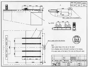Ci-dessous, schéma d'implantation des chemins de roulement sur le quai (à gauche) et détails des bogies de transfert (à droite). Un clic sur ces schémas conduit aux documents grand format PDF.