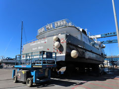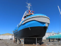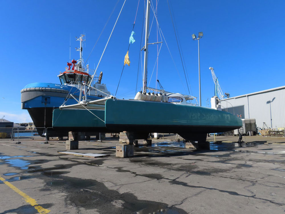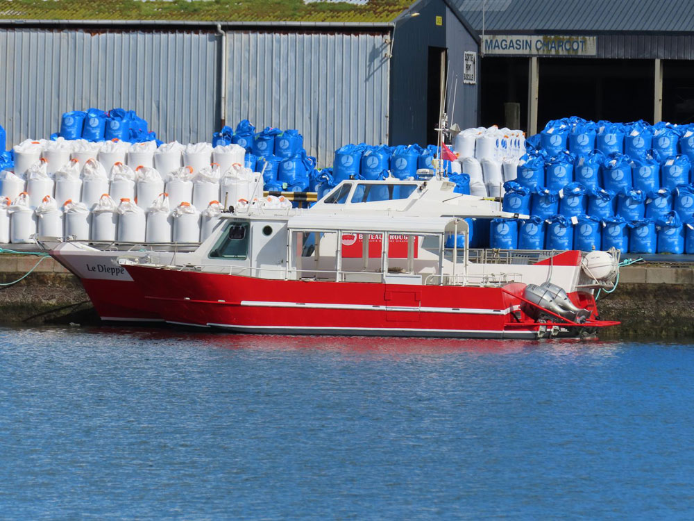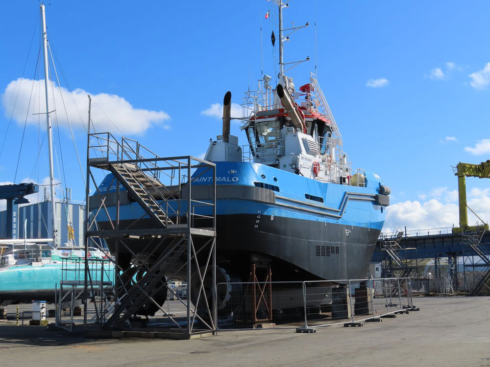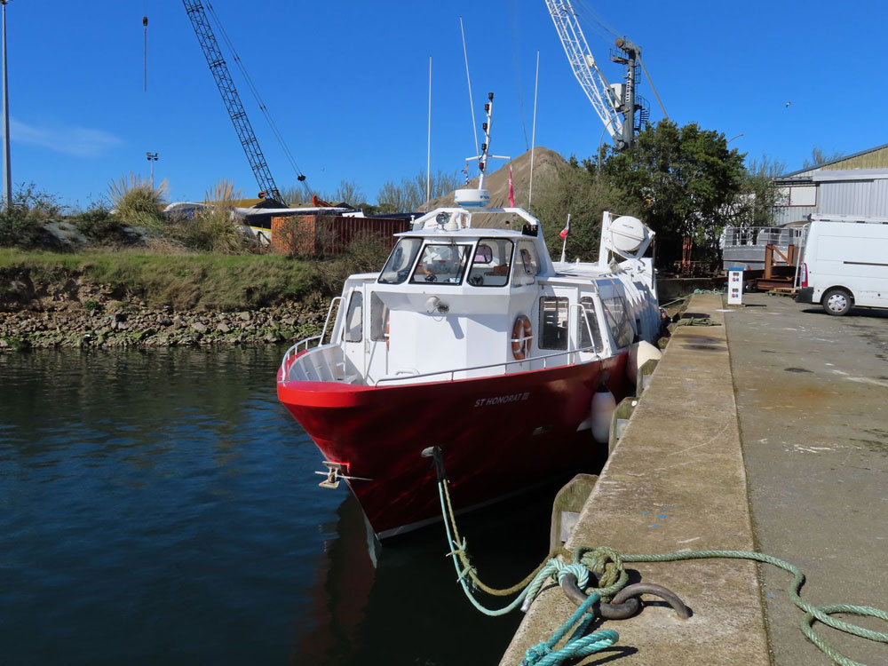 On continue notre promenade sur l’aire de carénage du port de commerce malouin : le ST HONORAT III des Bateaux Rouges est à flots, tandis que la vedette CORSAIRE DES ÎLES III (ex ENEZ EDIG) est au sec. Aux côtés du remorqueur SOLIDOR, le catamaran EPHATA se refait une beauté pour la nouvelle saison. Ce catamaran propose des balades en baie de Saint-Malo pour « des personnes fragilisées vivant toute forme de souffrance : handicap physique, troubles mentaux, solitude ou exclusion, maladie de longue durée… » (source : site internet de l’armateur Emeraude Voile Solidaire). |