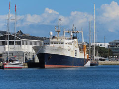 | Juste derrière, le dernier chalutier terre-neuvier français, JOSEPH ROTY II, attend son heure. D’ici quelques semaines, le chalutier désarmé depuis fin 2023, devrait être pris en charge par un remorqueur pour l’envoyer à la démolition en Belgique. |