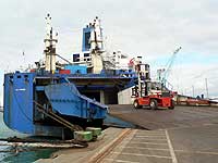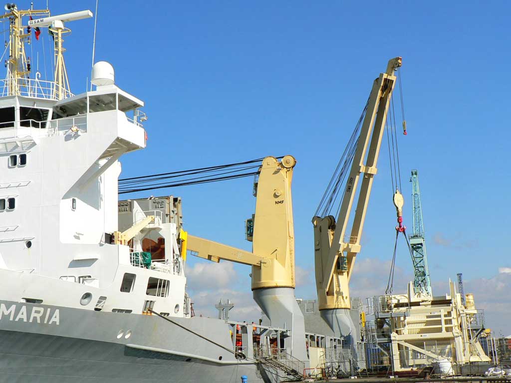 Les grumes (bois tropicaux) sont sorties des cales par la grue du quai (33,5 t sous crochet à 20 m) |